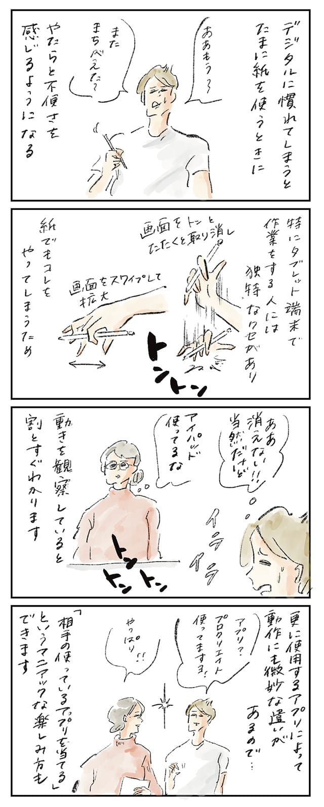 これ、タブレット端末で描きものをする人あるあるなので、手もとを観察してみると面白いですよ。上級者になると、その人がどんなアプリを使っているかもわかります。