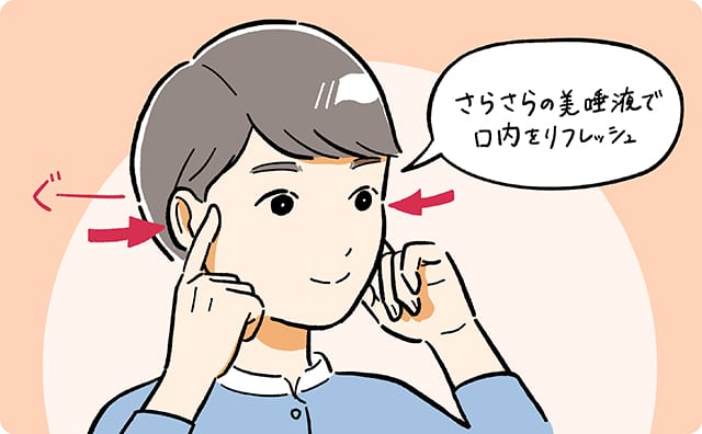 耳上部の前あたりにある小さなくぼみが唾液のツボ。ここを「指の腹で10秒押して離す」を5~10回繰り返します。そうすることで、耳下腺が刺激されて唾液の量が増えます。