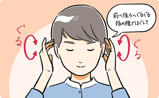 かたくなった側頭筋を「お疲れさま」という意味も込めて、人差し指、中指、薬指の3本で前へぐるぐる5回、後ろへ5回マッサージします。血流がよくなり、次の日のむくみ、たるみ予防にもなりますよ。