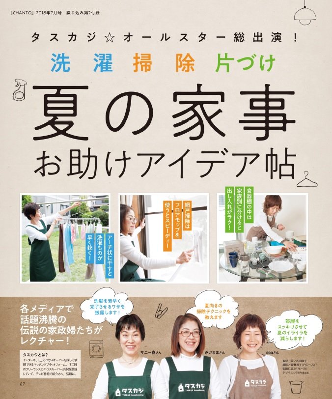 家事代行マッチングサービス「タスカジ」で活躍するハウスキーパーさん監修のもと、夏ならではの掃除・洗濯・収納のお悩みをスッキリ解決する付録。これからの季節の”困った!”のとき、ぜひ開いてみてください。