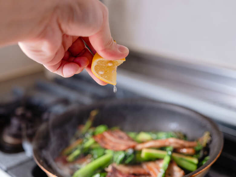 そこへ、塩、黒こしょう、オイスターソース、酒、レモンをギュッと搾り入れます。レモンの爽やかな香りとオイスターソースの濃厚な香りが、この料理のお供にするのは、お酒のなのか、ご飯なのかと食欲をそそります。