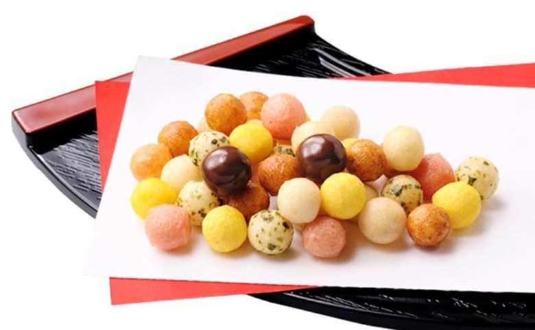 「関西風ひなあられ」のシェアを誇るその特徴は、厄除けの色とされる、赤、青、黄、白、黒の5色に、チョコがけのひなあられが加わったミックススタイルです。