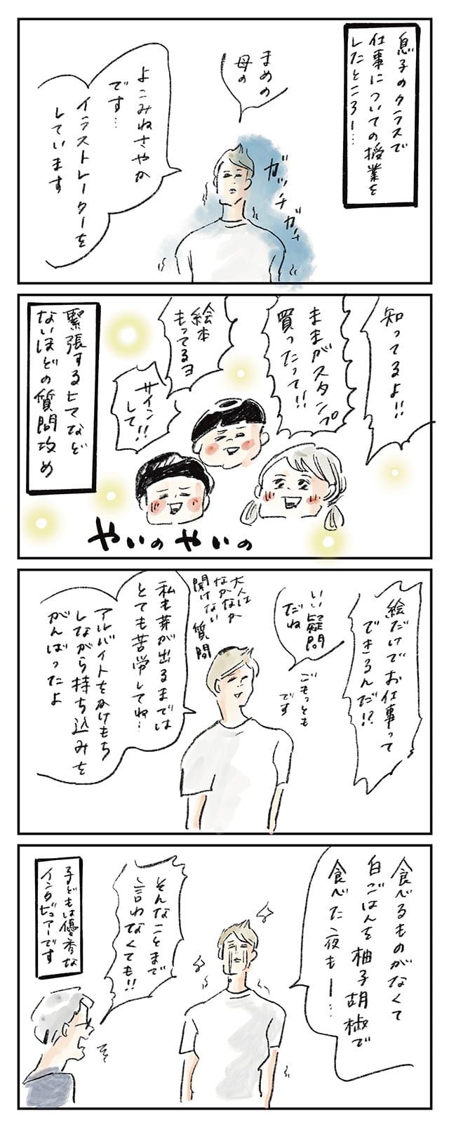 先日、宿題で息子のまめ(6歳)から仕事についてのインタビューを受けた話に触れましたが、その流れで、イラストレーターという職業がどんなものかというテーマで、小学校で授業をさせていただくことになりました。