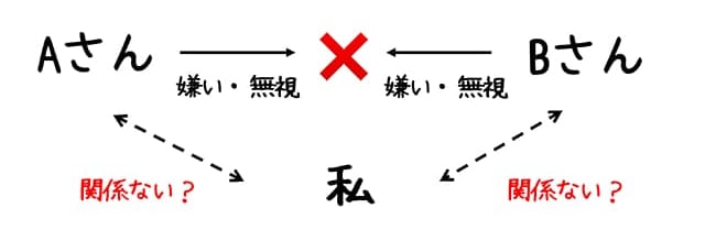 例えば、Aさん、Bさんと「私」の位置を客観的に考えて紙に書いてみてください。何か見えてくるものがありませんか?それは、「私」とAさんBさんの間に矢印は発生しないという事実です。