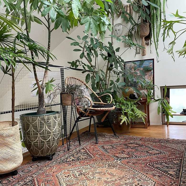 Rieさんのご自宅のアイコンとなっているのは、赤、紺、茶、緑…さまざまな色で織られたたくさんのヴィンテージラグ。高低差をつけて散りばめられたグリーンとも相まって、異国情緒がただよっています。