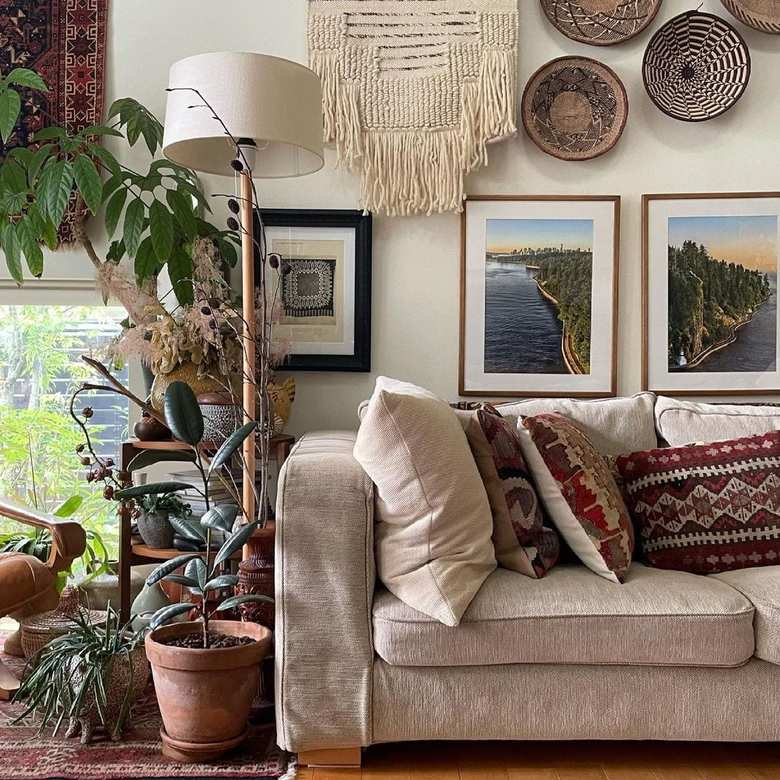 リビングには、約90年前に作られたハムセラグを壁にかけて。レンガ色と紺色が美しく、タイムレスコンフォートのソファ、観葉植物のアルテシマと合わせ、くつろげる空間になっています。