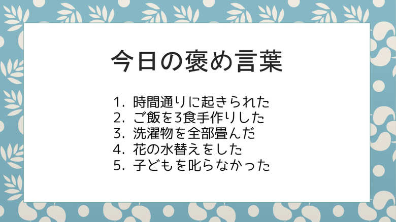 自分を褒める言葉をノートに記し、そのノートを家族や友人に渡して「ここに書いてあることを私に言って」とお願いしてみてください。子どもに頼むのもいいですよ。