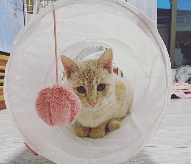 30個ぐらい名前の候補がありました。沖縄から命を繋いで来たのでその縁を大切にしたいと思い「首里」、寅年に来たから「虎」と合わせて「首里虎」としました。今は首里ちゃんと主に呼ばれています。初めてあったときは、人間に怯えるかなと思ったけれど、新屋さんのところであたたかくしてもらったんでしょうね、すぐになついてくれました。