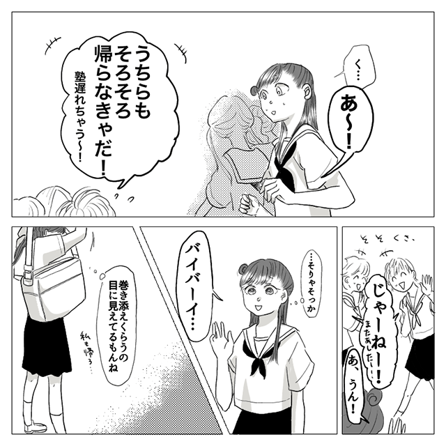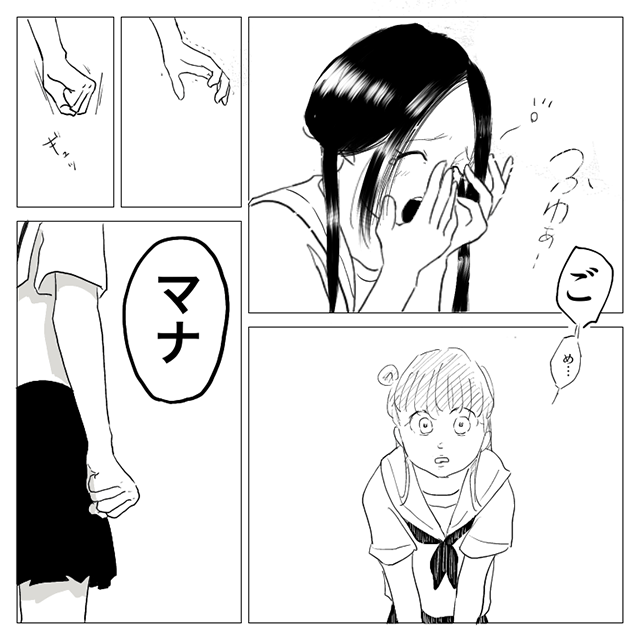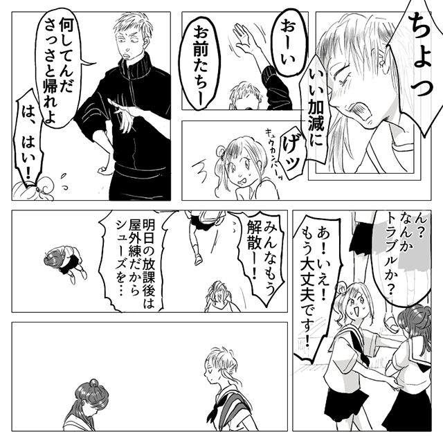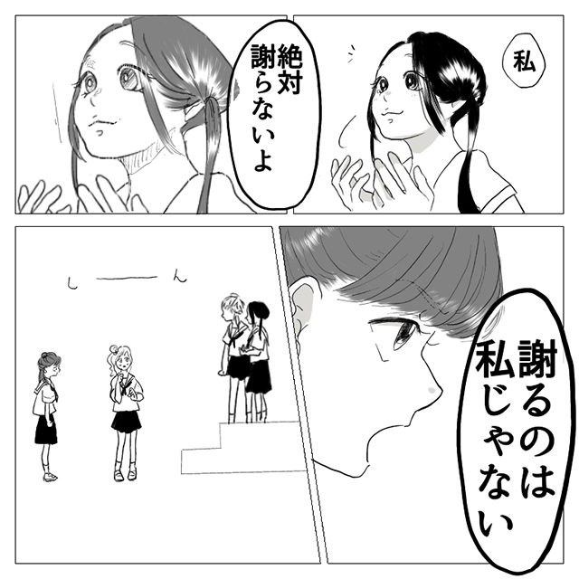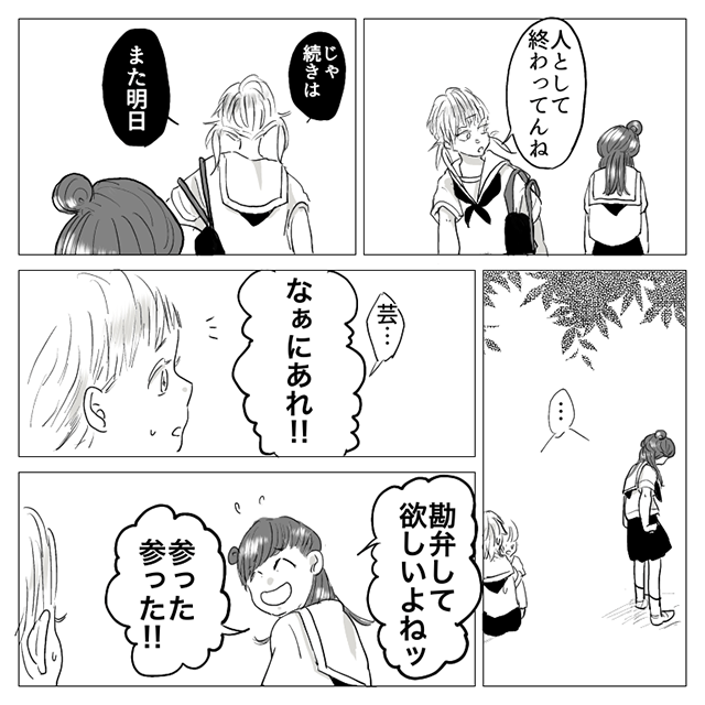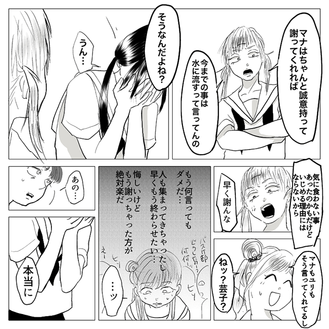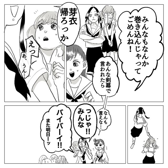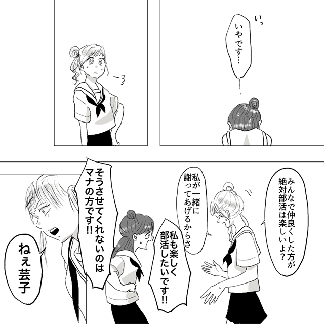 濡れ衣でもこの場をおさめるためには謝るしかない…諦めかけたときに見てしまったマナのあくび。部活顧問の登場で謝らずには済んだものの、みんなのよそよそしい態度に気持ちのやり場がない芸子でした。