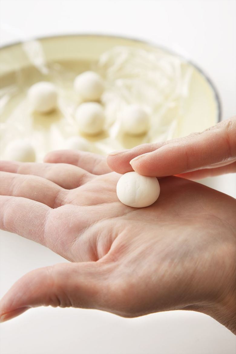ボウルに白玉粉、砂糖を入れて豆腐を少しずつちぎって加え、 なめらかになるまで混ぜていく。直径2㎝のボール状にまるめ、 たっぷりの熱湯でゆで、浮き上がってきたらさらに1分ゆでて水にとる。