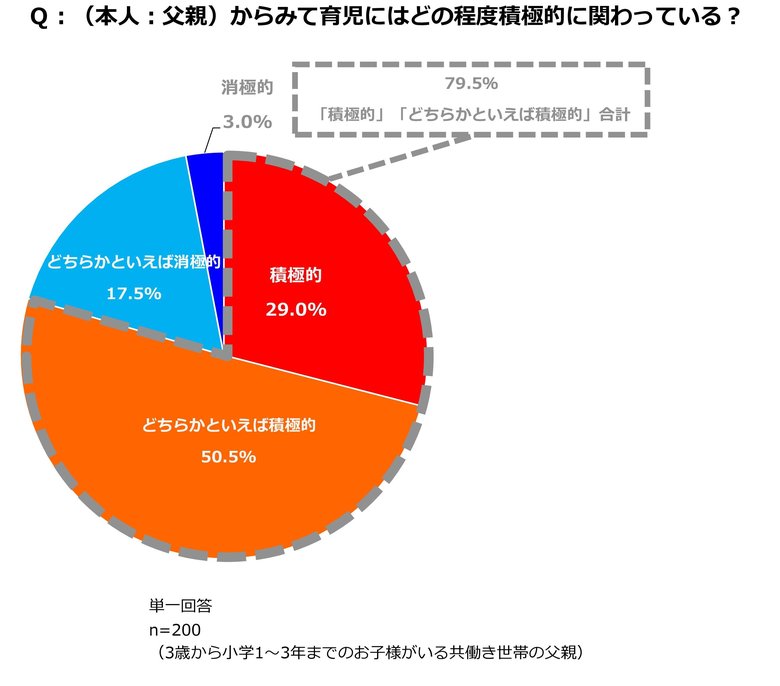 続いて、父親に対して「育児に積極的に関われているか?」と質問。その結果、全体の79.5%が「積極的に関わっている」と回答しました。