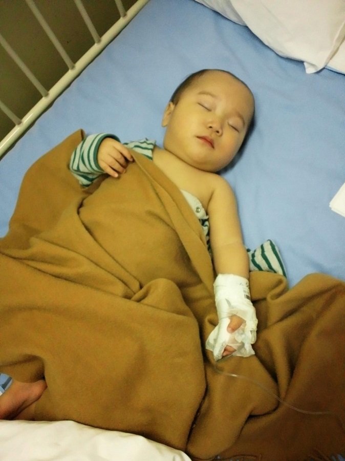 今すぐに市立病院へ行ってくださいと言われ、慌てて身の回りの用意をしてタクシーで病院に向かいました。そのまま入院になる予感がしたのでとりあえず泊まれる用意もして荷物を持ったのは大正解でした。 次男は川崎病の特徴である「腫れ」があまり出ておらず、診断に苦慮したようですが状況判断から上記治療薬である免疫グロブリンを投与されることになりました。血液製剤なのでリスクもあるということで署名をしたのを覚えています。 別室に次男が連れていかれ、私は部屋の外で治療されるのを待っていたのですが部屋から大声で泣く次男の声が聞こえてとても切ない思いをしました。たぶん親には見せられないくらい子供を押さえつけて治療してたのでしょう。 予想通りそのまま家に帰れず、約2週間の入院生活が始まったのでした。 母子完全同室の病院だったため、小さな小児ベットに一緒に寝ていたので体が痛かったです。