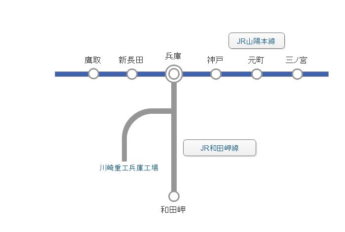 「工場地帯を走る路線なら退屈では…」と考える方も多いでしょう。ご心配なく!和田岬線は意外と見どころの多い路線です。兵庫駅を発車し、直線区間に入ったら、右手にご注目!右側には川崎重工兵庫工場があり、新しい鉄道車両を製造しています。工場では地元を走る通勤型電車から海外の車両まで、実にいろいろな車両をつくっています。運がよければ新しい車両が見られるかもしれません。