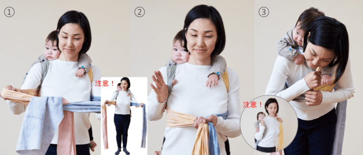 ※要注意:さらしをつかむときの手の甲が前方をむく形でつかむこと。逆につかんでしまうと、赤ちゃんをおろすときに困ります。