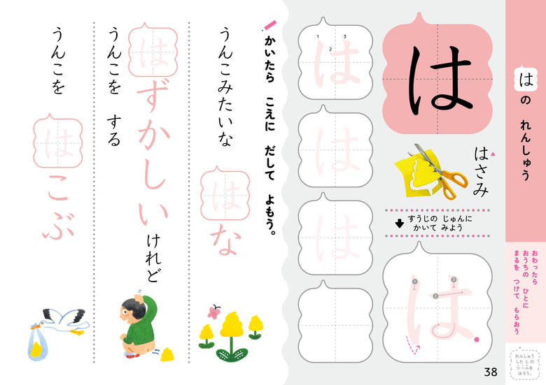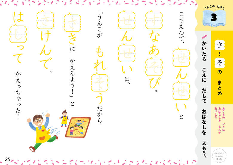 もちろん「うんこドリルシリーズ」と変わらない例文の面白さは今回も健在。「うんこみたいな はな」「はずかしいけれど うんこをする」「うんこを はこぶ」といった例文から、ひらがなを学ぶことができます。