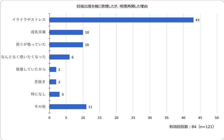 喫煙を再開した理由も調査したところ、「(育児や夫、周囲の人に対しての)イライラやストレス」が35.5%で第1位に。この数字は、同率で第2位になった「まわりが吸っていたから」と「母乳を卒業したから」の8.26%に大きな差をつけています。喫煙を再開した理由については、「なんとなく吸いたくなった」「我慢していたから」「息抜き」なども挙がっていました。