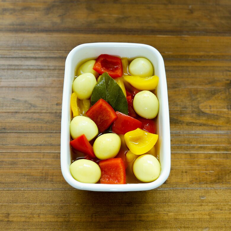 パプリカ(赤・黄)……各1/2個 うずらの卵(水煮)……12個