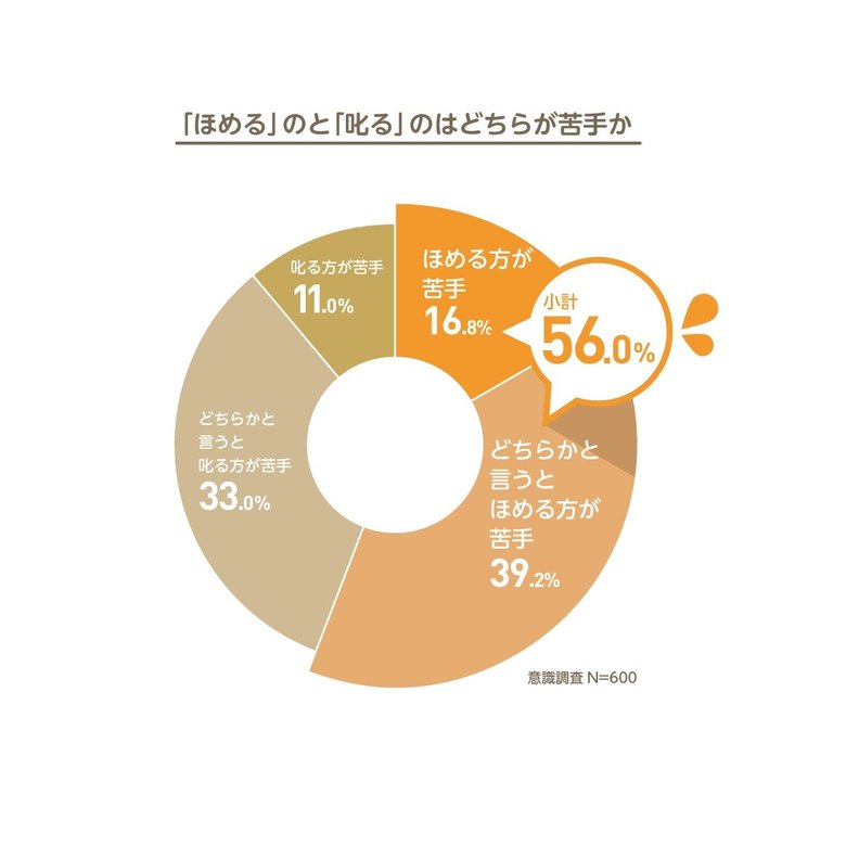 一般的に、自己肯定感を伸ばすためには「ほめること」が有効だといわれています。そこで、「子どもを『叱る』ことと『ほめる』ことのどちらが苦手か?」を調査。約6割(56.0%)の親が「ほめる方が苦手」と回答しており、ママ・パパの“ほめ力不足”の実態が浮き彫りになっています。叱るだけでなく、褒めてあげることも子育てでは大切な要素。意識して子どもをほめて、自己肯定感を伸ばしていきましょう。