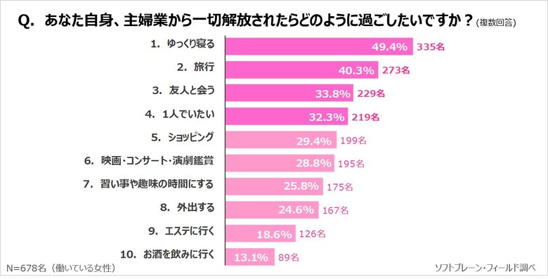 最後に、家事や育児などの主婦業から解放される日があったとしたら、どのように過ごしたいかを調査。「ゆっくり寝る」が49.4%で最も多く、「旅行」が40.3%、「友人と会う」が33.8%、「一人でいたい」が32.3%、「ショッピング」が29.4%、「映画・コンサート・演劇鑑賞」が28.8%と続きました。コメントには「目覚ましをかけずに、ゆっくり寝る」(40代)や、「気の合う友人と海外旅行に行きたい」(50代)、「一人で時間に縛られずに過ごす」(30代)など様々な願望の声が寄せられています。