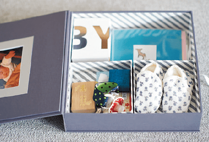 「へその緒や抜けた歯などの思い出の品は、見返すことに意味があるので、手が届きやすい場所に置いています」。ブック型の箱にしまって、アルバムと一緒に立てればスッキリ。