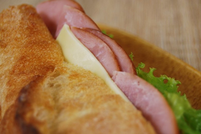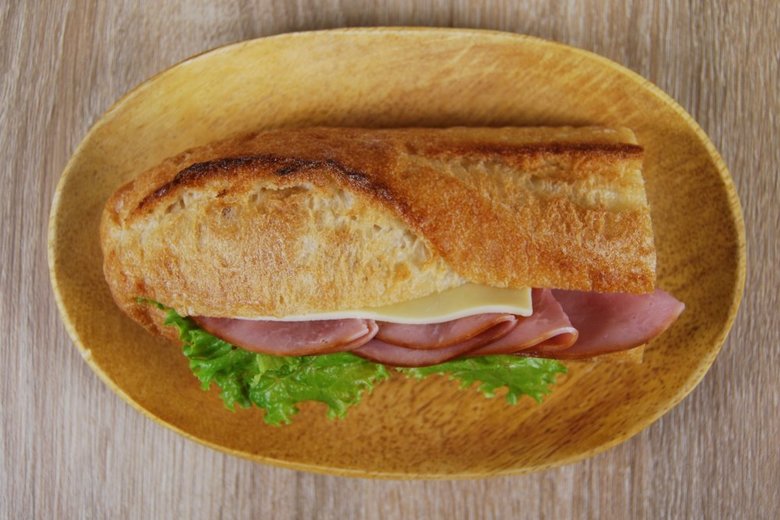 袋を開けてまず驚いたのが、同商品の“高級感”。一般的な食パンを使ったサンドイッチではなく、石窯で焼かれたフランスパンのようなパンを使用しています。半分に切られたパンの中には“ボンレスハム・ゴーダチーズ・グリーンリーフ”が挟まれていて、カラーリングはとても鮮やか。パーフェクトな彩りのおかげで、写真に収めてSNSに投稿すれば“いいね”がたくさん貰えるかもしれません。