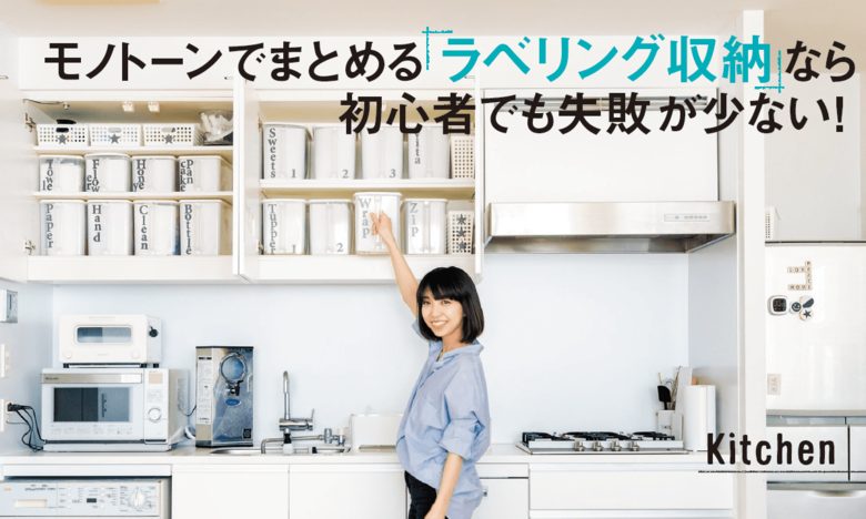 家電も収納用品も白でそろえたキッチンは壮観! ラベルは全体のバランスを見て、白黒が8 対2になるよう、貼るのがコツ。