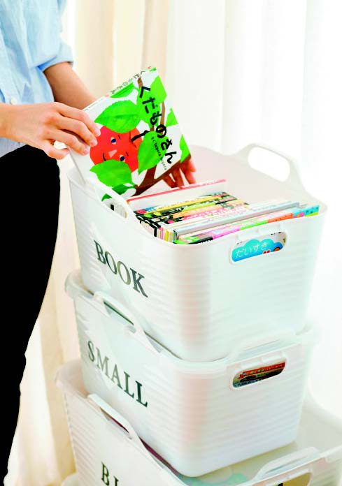 スタッキングできるソフトバスケットは、使用頻度の低い順に積むのがルール。いちばん上にはひんぱんに見る絵本を。あらかじめふたをはずして、出し入れしやすく。