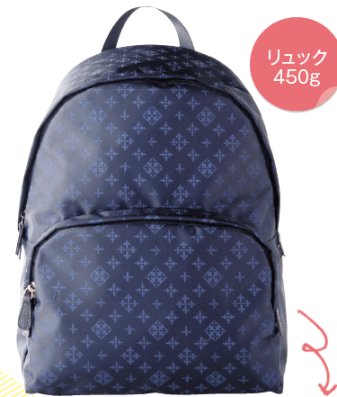 小さい子どもをもつワーママにとって、両手をあけておきたい場面は意外と多いもの。カジュアルに見えがちなリュックも、ネイビーにモノグラムのこんなシックなデザインなら、仕事用として十分使えそう。背中にあたる部分がやわらかく、女性の体にフィットしやすいので、少々荷物が多くなってもラクに背負える。[H32×W27.5×D16/外1、内2 ]1万8000円 /russet(russet 丸の内店)
