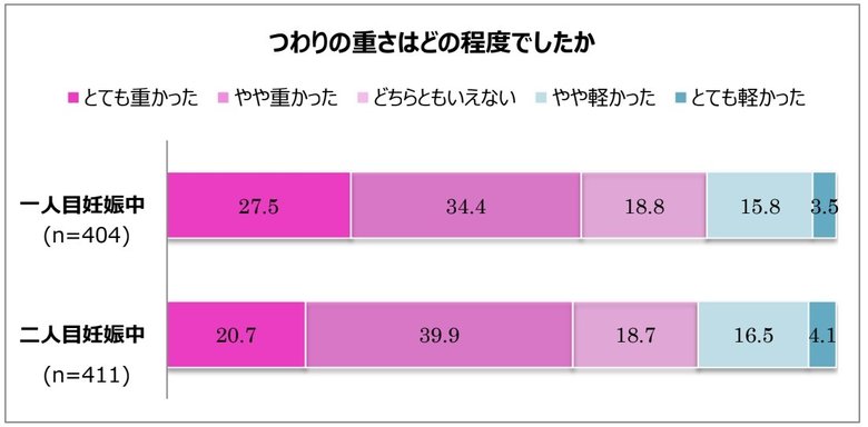 続いて、「1人目と2人目でそれぞれつわりを経験した人」につわりの重さを調査。「とても重かった」「やや重かった」と回答した人は、1人目・2人目ともに6割を超えました。「とても重かった」は約2~3割。日常生活に支障が出ていると見受けられる人も多く、つわりで苦しんでいる様子が伺えます。