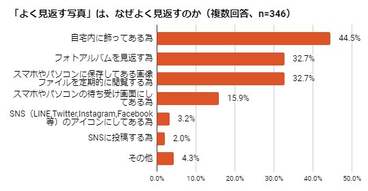 頻繁に見返す理由は「自宅に飾ってあるから」(44.5%)が最も多く、次いで「フォトアルバムを見返すため」「スマホやパソコンに保存してある画像ファイルを定期的に閲覧する為」(各32.7%)が続いています。