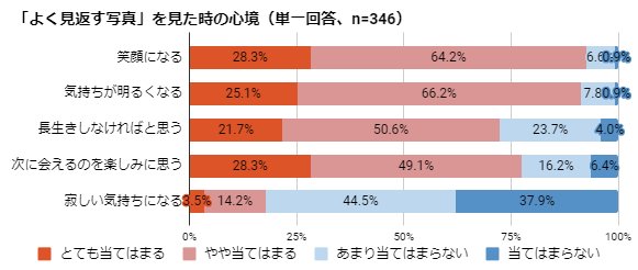 続いて「よく見返す写真を見た時の心境」を尋ねると、「笑顔になる」92.5%、「気持ちが明るくなる」91.3%、「長生きしなければと思う」72.3%など、前向きな気持ちになりやすいことが判明。