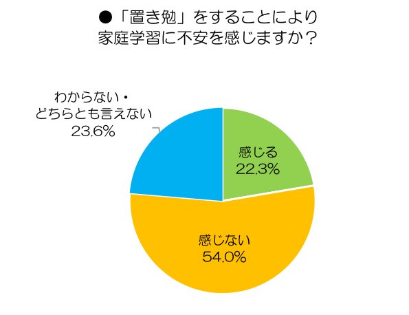 また「置き勉をすることで家庭学習へ不安を感じますか?」との質問に、「不安に感じる」と答えた人は22%という結果に。「不安」と回答した人からは、「子どもが必要な教材を持ち帰るのを忘れ、予習・復習や音読、ノートのチェックができないことが心配」という声が。一方、「不安に感じない」と答えた人は54.0%。半数以上の保護者が、置き勉に不安を抱えていないようです。