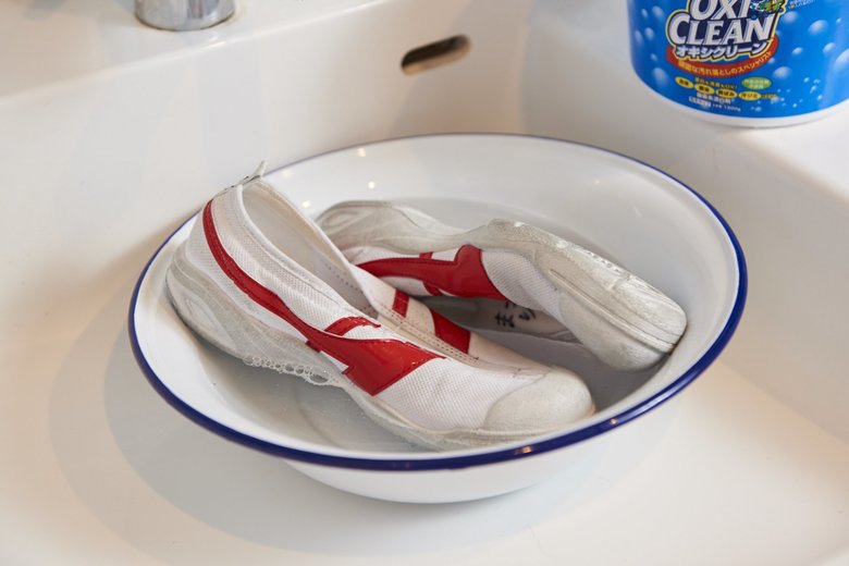 「全体的に黒ずむ上履きは、ポイントで汚れを落とすというよりも、じわじわと酸素の泡で落としたほうが効果的です。高温すぎない40度くらいのお湯で、6時間ほど漬け置きを」