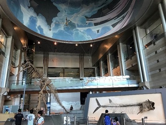 入ってすぐお出迎えしてくれる、巨大な恐竜と魚の化石。 天井を見上げると、鳥類が飛んでいる太古の空を感じます。