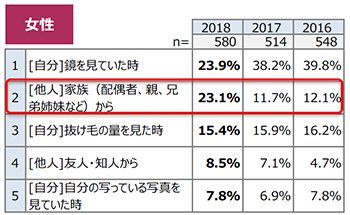 薄毛が気になり始める年齢は早まっているようですが、一体どのように気づいたのでしょうか? 「薄毛が気になり出したきっかけ」を聞いたところ、男女ともに「鏡を見ていた時」(男性:29.7%、女性:23.9%)が1位になっています。また「家族から指摘された時」との回答がどちらも2位に。同回答は男性が前年比6.0ポイント増、女性が前年比11.4ポイント増という結果になりました。