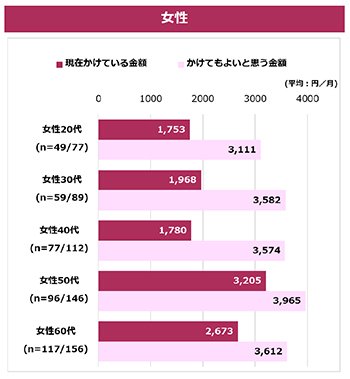 最後に「薄毛対策にかかっている金額と、薄毛対策にかけてもよい金額の上限」を調査。その結果、男女共に「かけてよいと思っている金額」が「実際にかけている金額」を上回りました。「かけてもよい金額の上限」は、20代男性が最も高く「7000円」。男性は、若いほど薄毛に危機感があるようです。
