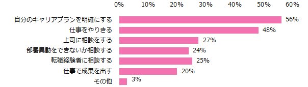 続いて「転職を決断する前に、やっておくべきこと」を調査したところ、「自分のキャリアプランを明確にする」(56%)が最多に。2位には「仕事をやりきる」(48%)、3位には「上司に相談する」がランクインしています。