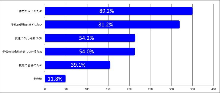 また「子どもに『スポーツ』をさせる目的は何ですか?」と聞いたところ、「体力向上のため」(89.2%)や「子どもの経験を増やしたい」(81.2%)が高い数字に。また「友達・仲間づくり」や「社会性を身につけるため」と回答した人も50%以上になっています。