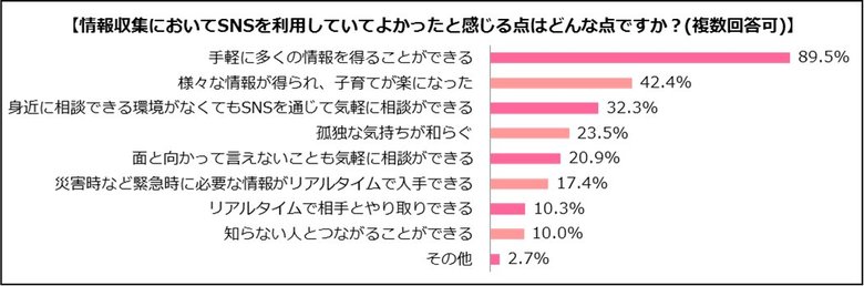 続いて「情報収集においてSNSを利用していてよかったと感じる点」を調査。「手軽に多くの情報を得ることができる」が89.5%で最も多く、知りたいコトをすぐに調べられる点をメリットに感じているママが多いようす。