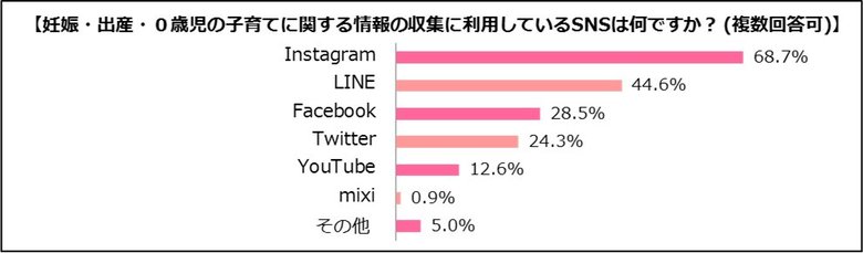続いて「妊娠・出産・0歳児の子育てに関する情報収集にどのようなSNSを利用しているか?」を調査。その結果、68.7%がInstagramと回答しました。