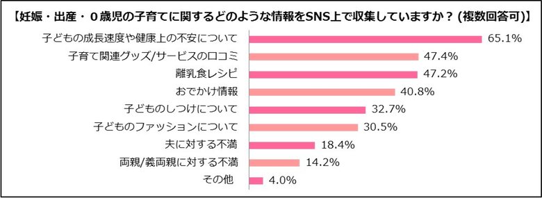 また「妊娠・出産・0歳児の子育てに関するどのような情報をSNS上で収集していますか?」と質問すると、「子どもの成長速度や健康上の不安についての情報」が多い結果に。さらに「子育て関連グッズ/サービスの口コミ」や「離乳食レシピ」など、生活に関連するあらゆる情報をSNSから集めていることもわかっています。