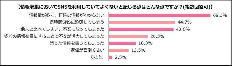 一方で「情報収集においてSNSを利用していてよくないと感じる点」についても質問したところ、「情報量が多く、正確な情報がわからない」が68.3%で最も多い結果に。SNSは手軽さが利点である反面、多くの情報が溢れており情報の取捨選択が重要になっているようす。特に健康面に関する情報については参考までに留め、専門家など信頼できる情報を判断材料にしているママの意見も多く聞かれました。