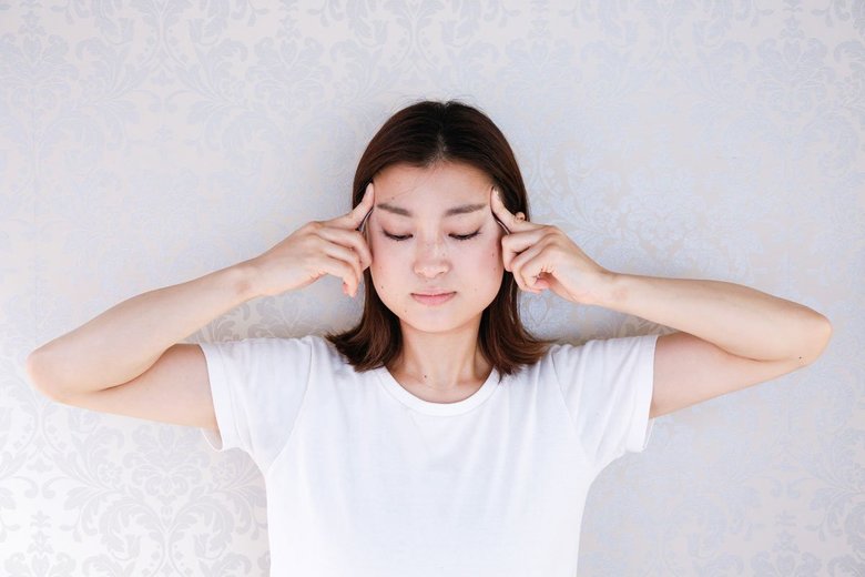 3:耳の上の側頭を押さえつけながら、筋肉を動かすようにグリグリ回します。片方ずつでも、左右同時でもやりやすい方でOKです。