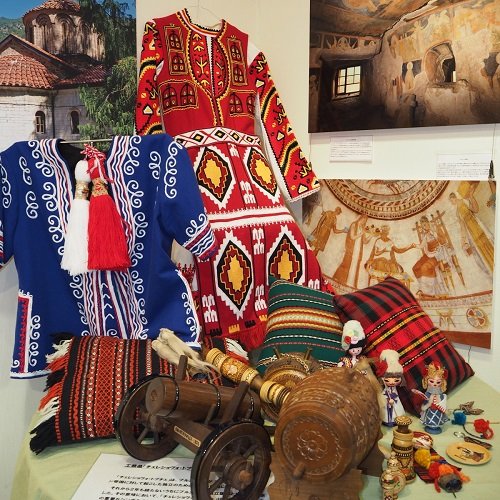 写真:「ブルガリアのダンス」「ブルガリア料理のプレートランチ」「ブルガリアの衣装や工芸品の展示」