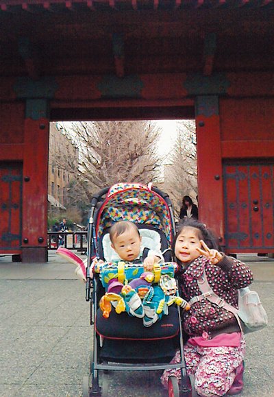 「東大の赤門前で記念撮影! 東大に赤ちゃん連れで入れるのも、育休中ならでは」