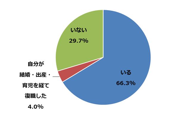 続いて、経営者と女性社員を対象に「あなたの会社に結婚・出産・育児を経て職場復帰した女性社員はいますか?」と質問。その結果、「いる」の66.3%と「自分が結婚・出産・育児を経て復職した」の4.0%を合わせた7割が「職場復帰した女性社員がいる」と回答しました。