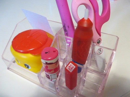 最近DAISOの新商品でこれは!と思ったのが化粧品収納コーナーでみつけたアクリル製の収納。しっかりした作りで150円商品でした。もともとは口紅やマスカラを立てて収納できるようにしっかり区切られていて、ひとめで何が入っているのか見えるように階段状のつくりになっています。この区切りが子どもの文房具類の収納にぴったり。 我が家では、広い部分にフエキ糊を入れて、口紅などを立てる部分にハンコやスタンプを収納しています。 この収納のいいところはひとつひとつのものがピタっとはまり、何が片づけられていないのか一目でわかるところ。定位置が決まるのでお片付けへの意欲が湧くようです。なお、色は透明少しピンクがかった透明がありました。見た目にもリッチでかなりコスパの良いアイテムだと思います。