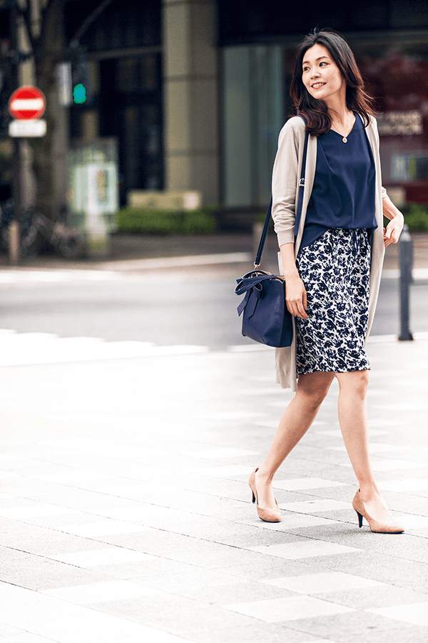 白ブラウス&ネイビーのロングカーデは好感度ばっちりの鉄板セット。スカーフやカラーパンプスでアクセントをつけるだけで、即、通勤コーデが完成! ブラウス&カーディガンセット8300円/ファビュラスアンジェラ(ファビュラスアンジェラ 小田急百貨店新宿店)