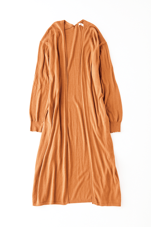 軽くてシワになりにくいから、意外に脱ぎ着が多い時期に重宝できる1枚。旬のテラコッタカラーで秋らしく。カーディガン3990円/アース ミュージック エコロジー( アース ミュージック エコロジーレッド ストア新宿)