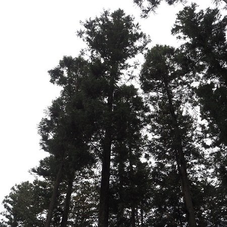 写真:「真っすぐ天高く伸びている杉」、「立派な太さの幹を持つ欅」